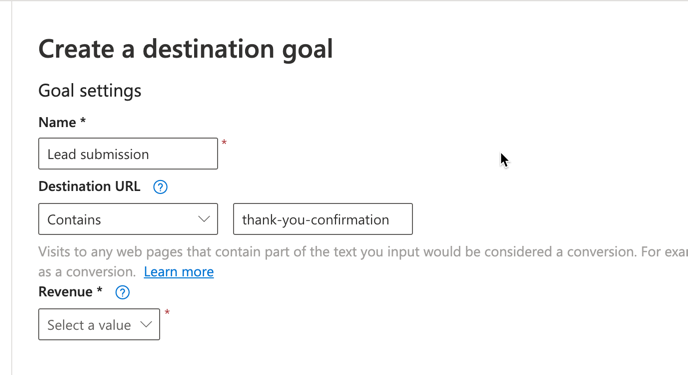 Add a name for the Goal, Destination URL (Thank you page). Note is important to make sure the destination URL is exactly as where you want to track the conversion event.