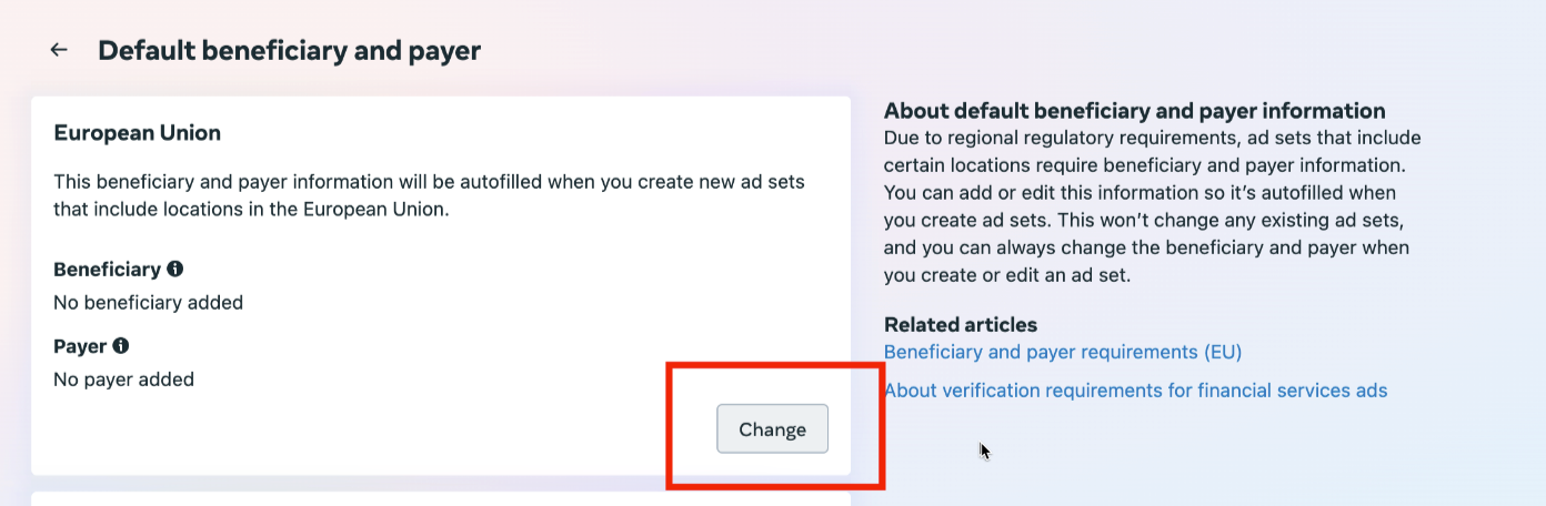5. After adding default beneficiary and payer go here - https://business.facebook.com/billing_hub/accounts/details select your ad account from the top right and ensure the payment information you have added includes all your business information.