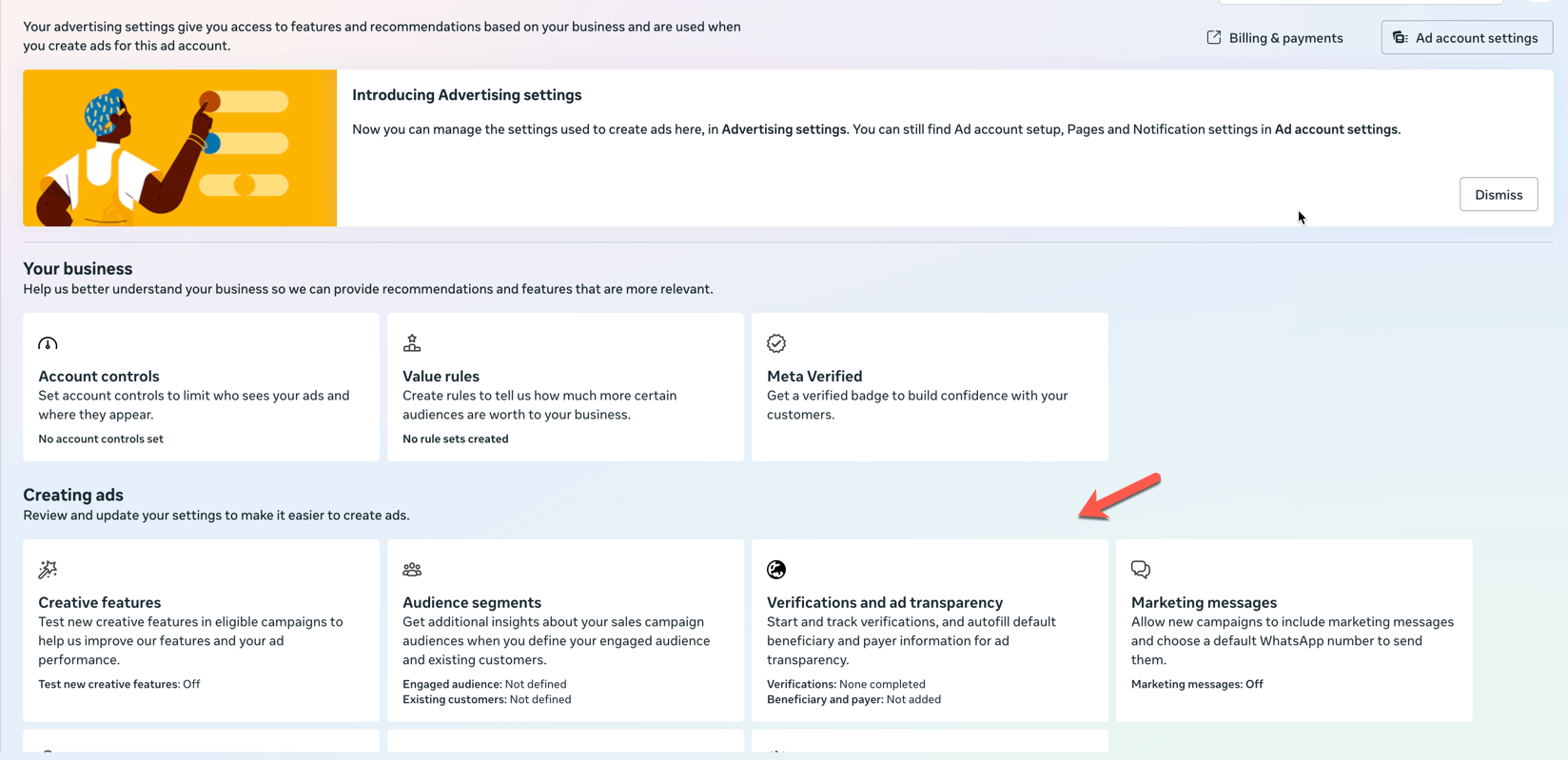 - Select Advertising settings on the left panel and choose Verifications and ad transparency:
