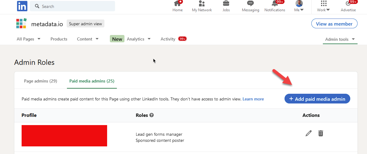 - Via LinkedIn Campaign Manager click Company Page -> Settings -> Manage Admins -> Paid Media Admins tab - > Assign Roles.