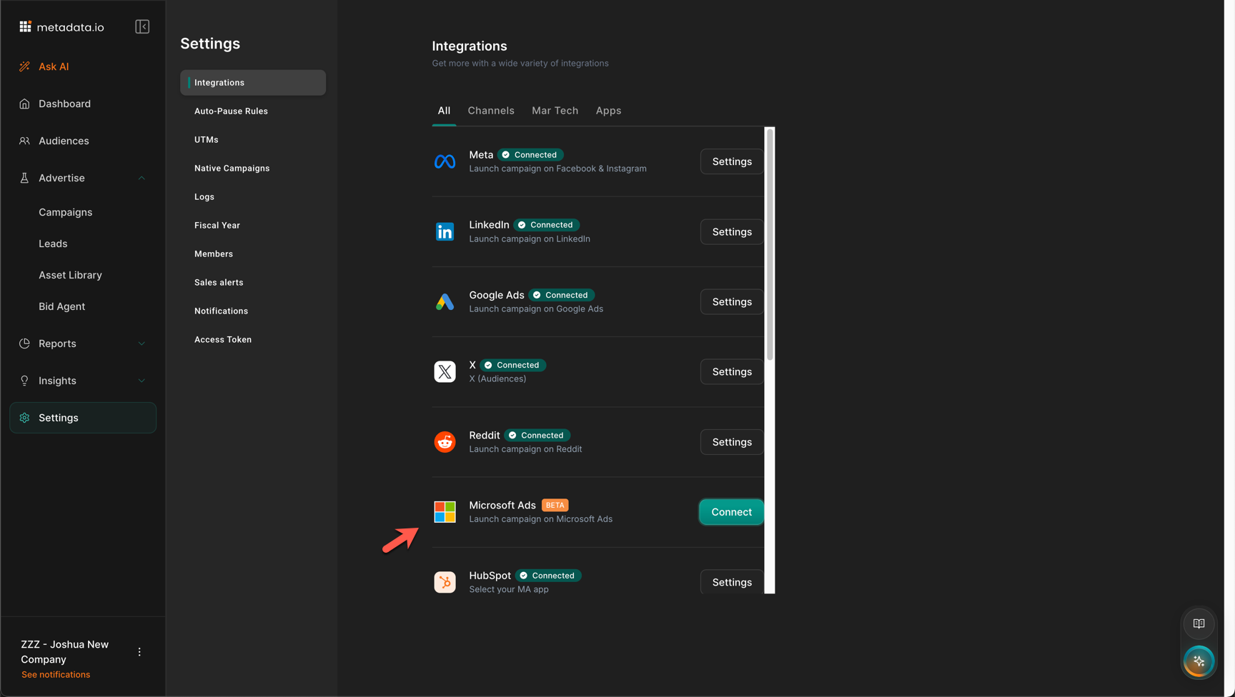 4 The Integration page will show that your Microsoft Ads advertiser account has been connected to the platform.
