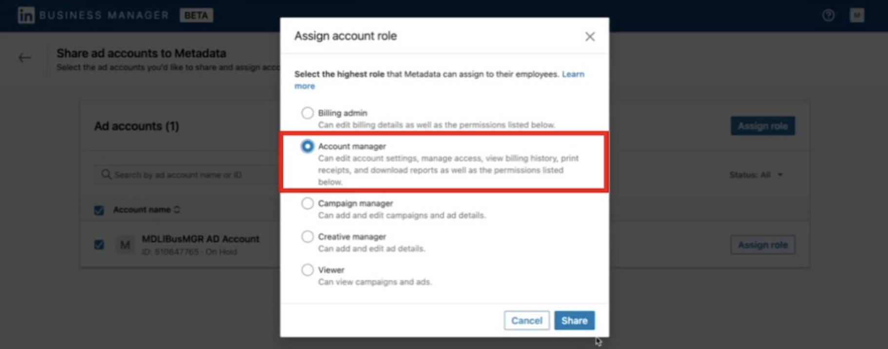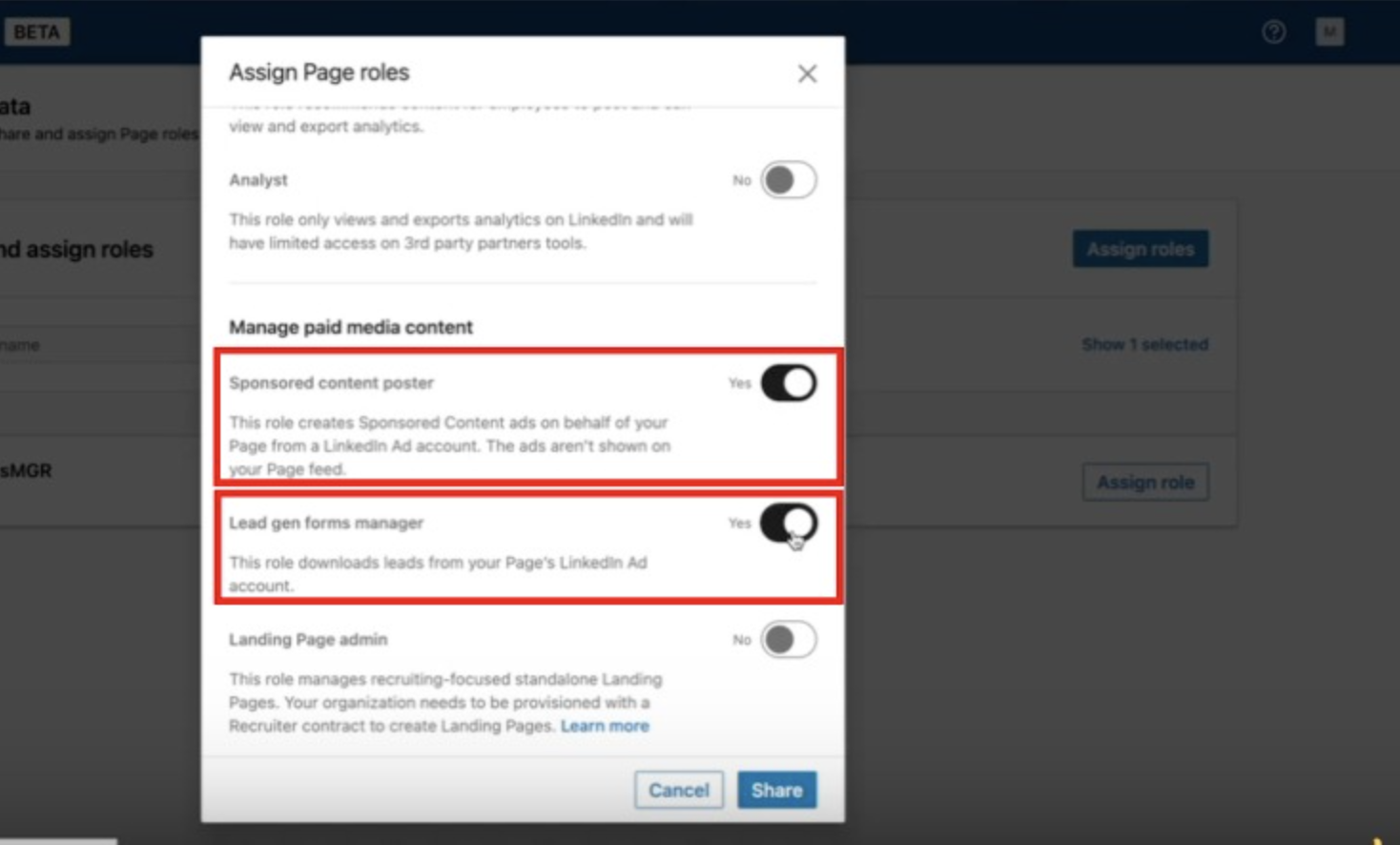 4. Scroll down and select Sponsored Content Poster and Lead Gen Forms Manager permissions, then share and view partner.