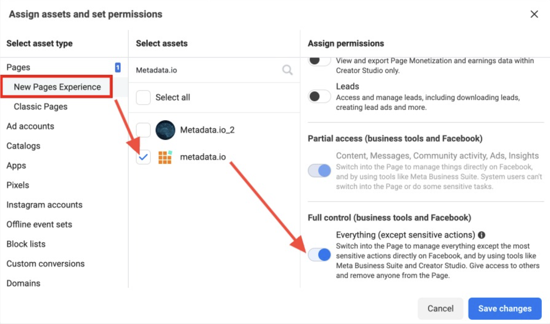 5. Select New Page Experience, then choose your page in the select assets section and assign everything permissions.