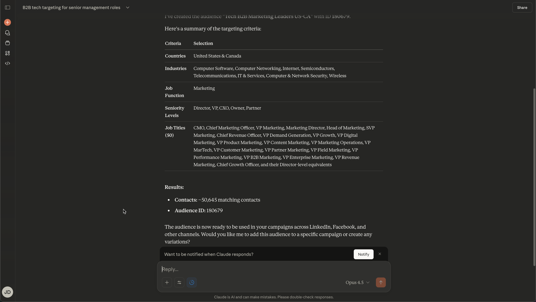 - Audience targeting configurations (firmographic, technographic, job level, geographic criteria)