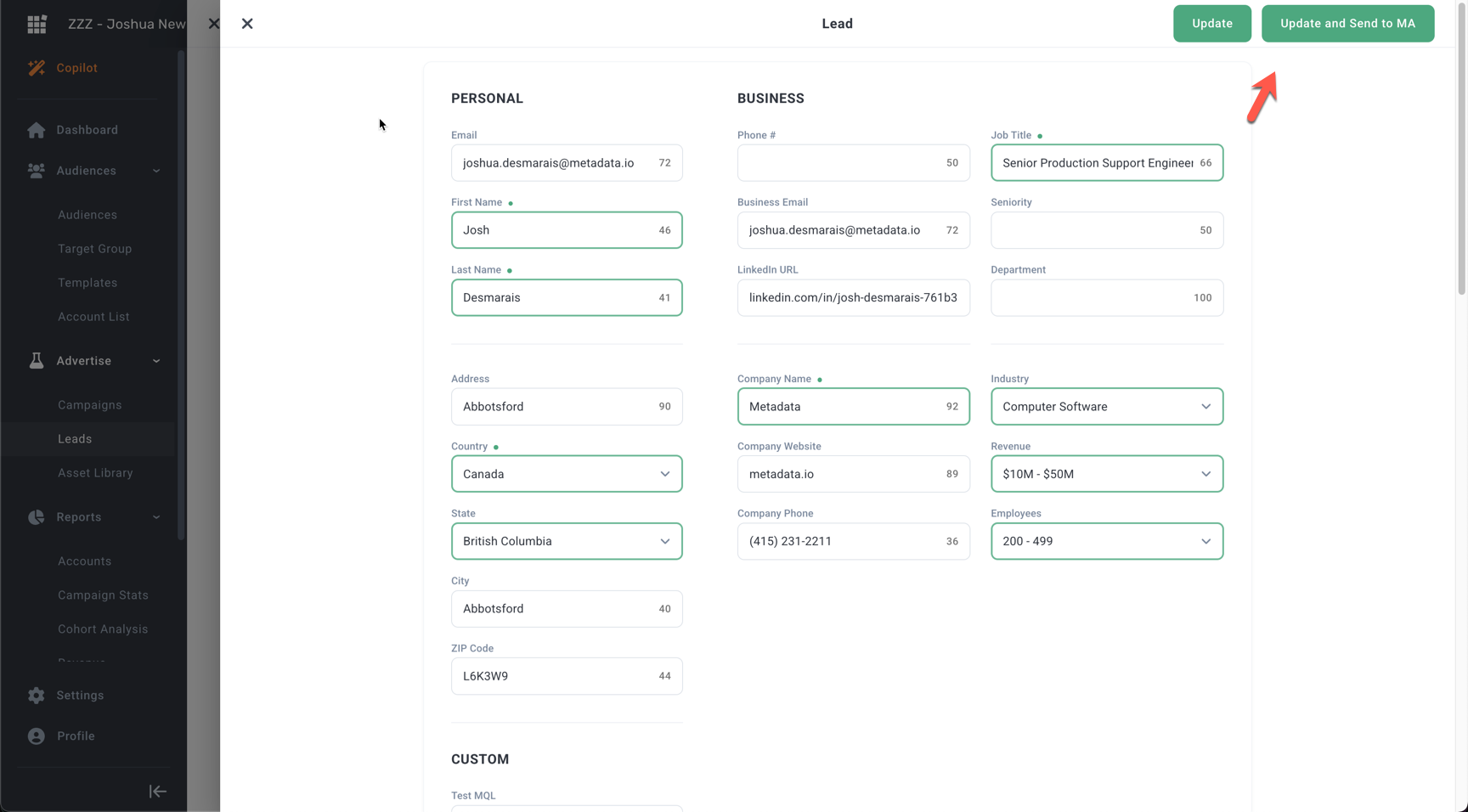 - To repush the Lead that has the error navigate to the Lead and open the details of the lead and click Update and send to MA: