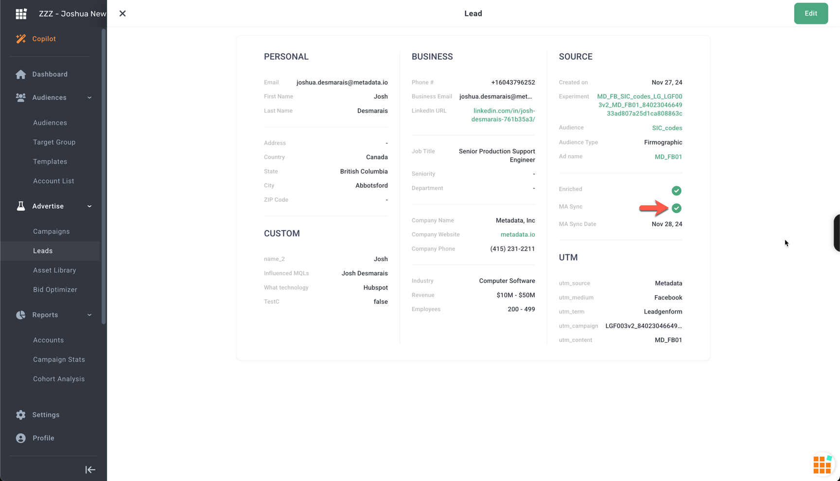 The Lead may have already been pushed to your Marketing Automation tool as our manual enrichment team may have already looked at the Lead and pushed it. If you need to check if the Lead is sync to MA you can view the details of the Lead: