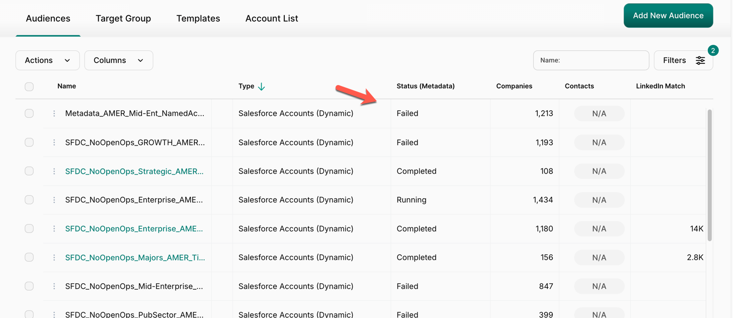 Audiences can fail uploading to the channel for a number of different reasons, in some cases you may just need to try re-uploading the audience again which you can do via the actions menu: